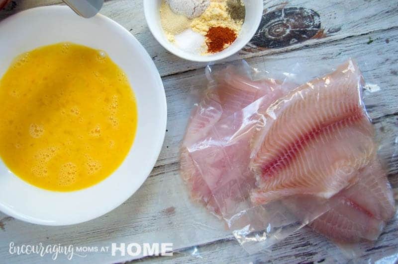 - First, dip a piece of tilapia into egg and allow excess to run off.
